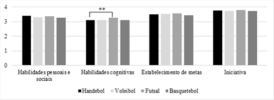 Em relação à modalidade (Figura 3), foram encontradas diferenças significativas entre a modalidade de handebol e voleibol (Proximidade: p<0.001, Comprometimento: p=0.001, Complementaridade: p<0.001), sendo a qualidade da relação treinador-atleta significativamente melhor na modalidade de handebol em comparação com voleibol. Para a experiência positiva (Figura 4), só foram encontradas diferenças significativas na variável habilidades cognitivas entre o handebol e o futsal (p=0.007).
