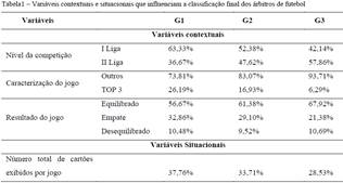 Através da análise da Tabela 1, verificámos que, em geral, para todas as variáveis contextuais, os valores de G1 são mais elevados em comparação com o G2 e G3. De forma mais específica, os árbitros G1 realizaram mais jogos de nível de competição superior (I Liga), realizaram mais jogos com equipas Top 3 e apresentaram valores médios em termos de resultado de jogo quando comparados com o G2 e G3. Em relação às variáveis situacionais, os árbitros do G1 foram os que apresentaram menor número de cartões exibidos por jogo. Os resultados alcançados pelo G2, estão tendencialmente na mediana, entre o G1 e G3 (Tabela 1).