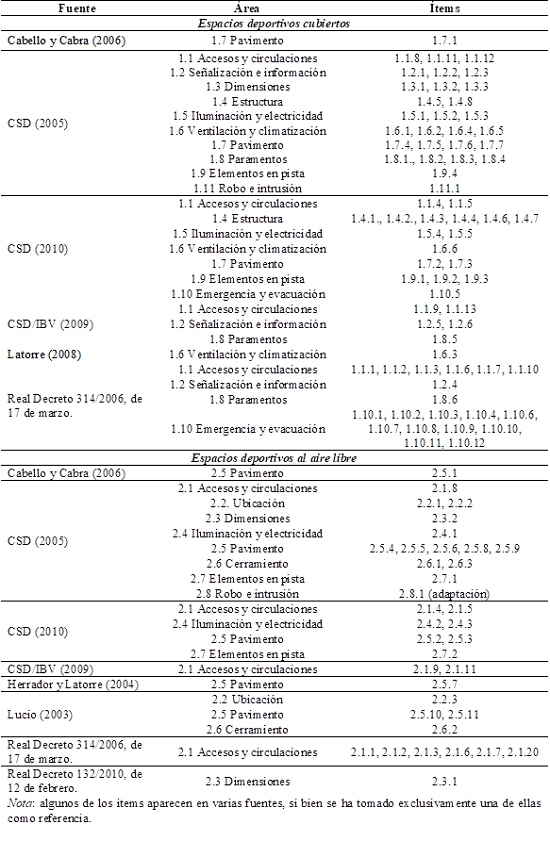 Para el presente estudio se confeccionaron dos listas de control ad hoc (anexos I y II ) de respuesta dicotómica (0=no cumple, 1=cumple) en función del tipo de espacio (cubierto o al aire libre), con el objetivo de analizar el cumplimento de los requisitos de seguridad y accesibilidad establecidos en la normativa NIDE y UNE-EN, legislación vigente, así como en los manuales de referencia y herramientas diseñadas en estudios previos (Cabello & Cabra, 2006; CSD, 2010; CSD/IBV, 2009; Herrador & Latorre, 2004; Latorre, 2008; Lucio, 2003) (Tabla 1).