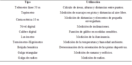 Asimismo, previamente a la recogida de datos, el investigador principal llevó a cabo una formación impartida por una empresa especializada entre los días 11 y 15 de abril de 2016, con una duración total de 9 h., para realizar una correcta utilización de los instrumentos de medición que se utilizaron en la presente investigación (Tabla 2), procediendo en la misma sesión a comprobar la correcta calibración de los equipos los cuales, además de la medición tradicional, permitían en la mayoría de los casos la electrónica o digital para mejorar la sensibilidad de la medida.