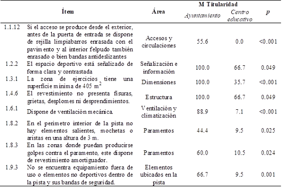 Se detectan en los espacios deportivos cubiertos diferencias estadísticamente significativas en función de si éstos son titularidad del centro educativo o son pabellones de titularidad municipal de uso compartido, respecto a la disposición de elementos que aseguren una correcta transición desde el exterior, la existencia de señalización de los espacios, el cumplimiento de la superficie mínima requerida, el buen estado del revestimiento, la presencia de ventilación mecánica, la ausencia de elementos salientes en los paramentos, disposición de revestimiento amortiguador en las zonas donde puedan producirse impactos y la ausencia de equipamiento fuera de uso dentro de la pista o en las bandas de seguridad, observándose en todos estos aspectos un mayor cumplimiento de la normativa en aquellos de titularidad municipal.