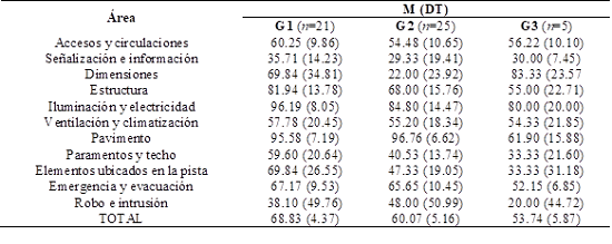 Asimismo, se realizó un análisis de conglomerados en función del porcentaje de cumplimiento de cada una de las áreas que componen los espacios deportivos al aire libre y cubiertos, mediante clúster jerárquico utilizando el método de Ward y posterior comparación de medias.