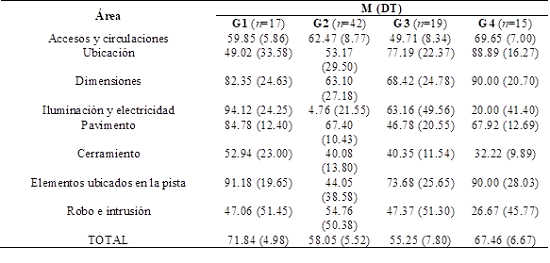 Atendiendo a la comparativa del porcentaje de cumplimiento general de los diferentes conglomerados, es el primero (G1) el que alcanza una mejor puntuación con el 71.84%. Este resalta en primer lugar por el alto cumplimiento de los aspectos relacionados con la Iluminación y electricidad (94.12%) y por la adecuación de los Elementos ubicados en la pista (91.18%). Respecto al segundo grupo (G2) se aprecia cómo ninguna de las áreas analizadas supera el 70% de cumplimiento en ninguno de los casos, resaltando por su baja valoración los aspectos relacionados con la Iluminación y electricidad (4.76%), distanciándose de los valores obtenidos por el resto de grupos. El tercero de ellos (G3) es el que alcanza un porcentaje inferior general de cumplimiento (55.25%), si bien resalta por la correcta Ubicación del espacio en un 77.19% de los casos. Por último, el G4 destaca tanto respecto a las adecuadas Dimensiones del espacio como en la correcta disposición y seguridad de los Elementos ubicados en la pista, con un cumplimiento ambos del 90%.