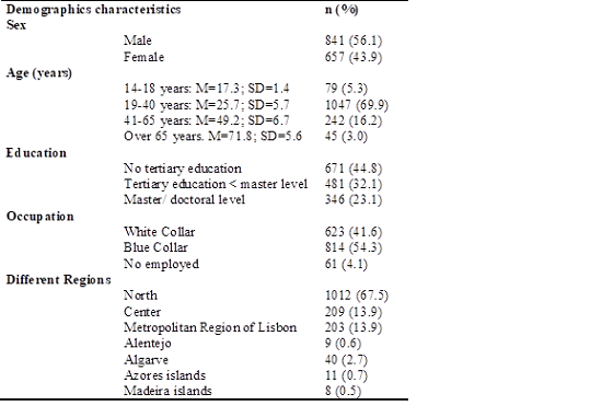 Participants were N = 1498, of both sexes (N = 841 females) with ages between 14 and 85 years. Participants were categorized by age into adolescents (ages 14-18 years; N = 135), young adults (ages 19-40 years; N = 1047), middle-aged adults (ages 41-65 years, N = 271), and older adults (aged older than 65 years, n = 45). This is the most common procedure for stratifying samples by age group, which correspond to the Erikson's stages of psychosocial development (Ahroni, 1996; Erikson & Erikson, 1998). The demographics characteristics of participants are displayed in Table 1.