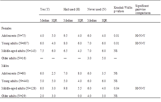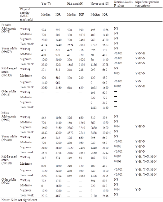 Table 2 shows the median and interquartile range (IQR) for PA by sex and age, and the results of Kruskal-Wallis test for the difference in PA between the participants that use, had used and never used PAT.