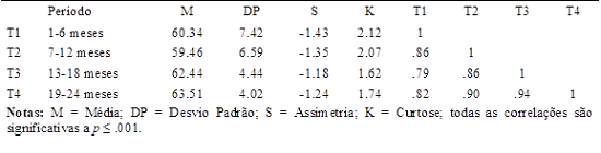 Relativamente à taxa de abandono: 39% (n = 1867) abandonaram a prática de exercício físico entre T1 e T2, 25% (n = 1197) abandonaram a prática entre T2 e T3 e 10% (n = 479) abandonaram a prática entre T3 e T4. A média das entradas semanais apresenta um valor de aproximadamente duas sessões de treino por semana, em que o T4 apresenta a média mais elevada (M = 2.31; DP = .92). A Tabela 1 evidencia os valores de uma distribuição normal da frequência no ginásio durante os quatro momentos, dado os valores de assimetria e curtose estarem contidos dentro dos limites pré-estabelecidos. Todas as correlações são significativas entre os momentos analisados, sendo que a associação entre T3 e T4 apresenta o valor mais elevado.