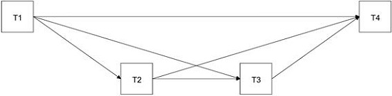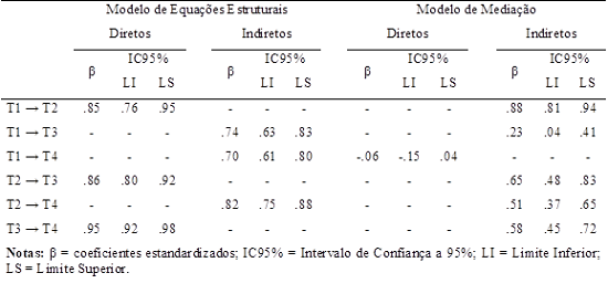 De acordo com os resultados do modelo de equações estruturais (Figura 1), todos os efeitos diretos são positivos e significativos (ver Tabela 2), sendo que o efeito entre o período T3 para o período T4 apresenta a predição mais significativa. Igualmente, os coeficientes dos efeitos indiretos entre o período T1 para o período T4 e o período T2 para o período T4 são positivamente significativos. Nesse sentido testamos um modelo de mediação traçando regressões entre todos os momentos em análise. De acordo com os resultados do modelo de mediação (Figura 2), é possível de observar que o efeito direto é significativo. Igualmente, os efeitos indiretos são significativos entre todos os momentos (ver Tabela 2). Os resultados mostram a existência de mediação total entre o período T1 para o período T4, dado o efeito indireto total apresentar um coeficiente (β = .91 [.82, 1.02]) superior e significativo comparativamente ao efeito direto entre o período T1 para o período T4. Nesse sentido, podemos assumir que o período T2 e T3 são mediadores entre o período T1 para o período T4.