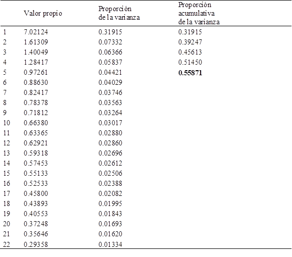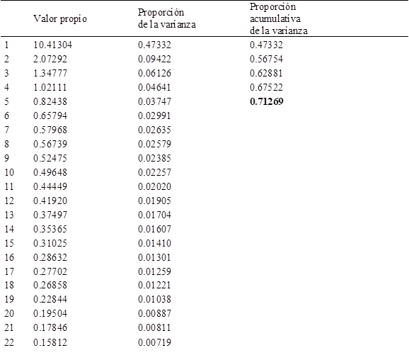 El resultado de ambas pruebas mostro, que la matriz de correlaciones entre los ítems obtuvo un alto valor (Chi cuadrado (231)= 16137.1; p<.001). La medida de adecuación muestral del índice KMO fue de .94 con estos resultados se puede afirmar que la matriz de datos era adecuada.