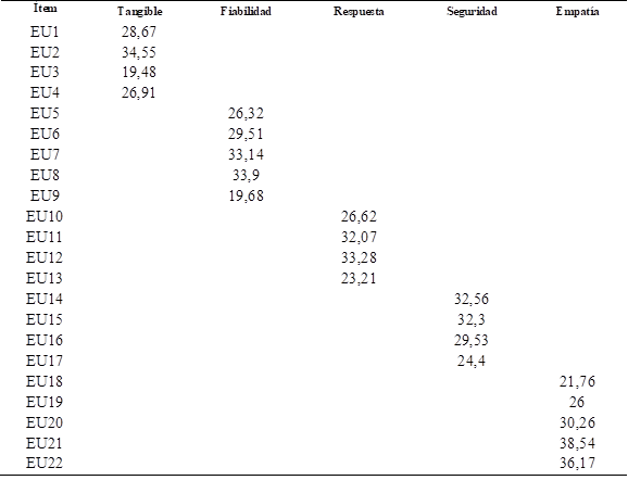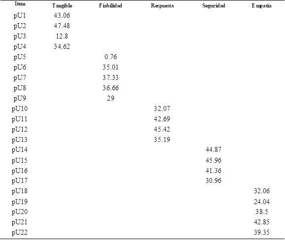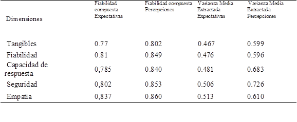Los ítems, tanto en las expectativas como en la de las percepciones, se han agrupado, en función de cinco dimensiones originales y confirmadas en otra investigación (Morales-Sánchez, Hernández-Mendo y Blanco, 2009): (1) Elementos tangibles: Apariencia de las instalaciones físicas, equipos, personal y materiales de comunicación. Declaraciones 1 a 4, con una fiabilidad en la escala de expectativas de 0.82 y la escala de percepciones de 0.85. (2) Fiabilidad: Habilidad para ejecutar el servicio prometido de forma fiable y cuidadosa. Declaraciones 5 a 9. Con una fiabilidad en la escala de expectativas de 0.90 y la escala de percepciones de 0.89. (3) Capacidad de respuesta: Disposición y voluntad para ayudar al cliente y proporcionar un servicio rápido. Declaraciones 10 a 13, Con una fiabilidad en la escala de expectativas de 0.88 y la escala de percepciones de 0.89. (4) Seguridad: Conocimientos y atención mostrados por los empleados y sus habilidades para inspirar credibilidad y confianza. Declaraciones 14 a 17, con una fiabilidad en la escala de expectativas de 0.90 y la escala de percepciones de 0.92. (5) Empatía: Atención individualizada que ofrecen las organizaciones a sus consumidores. Declaraciones 18 a 22, con una fiabilidad en la escala de expectativas de 0.90 y la escala de percepciones de 0.90.