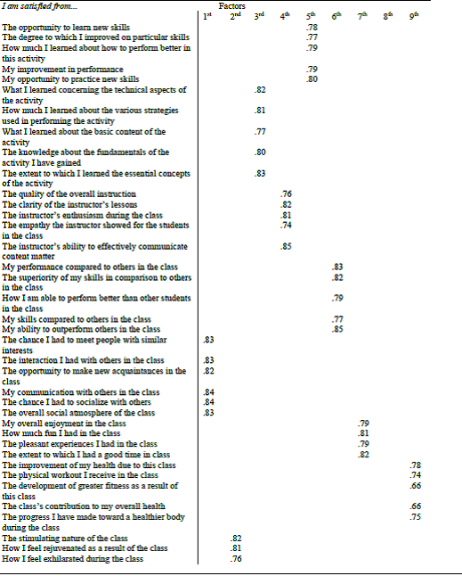 The questionnaire is composed of 45 questions and examines the nine factors of satisfaction. These factors are a. “Mastery Experiences” (ME), which examines satisfaction’s degree resulted from the opportunities offered for a broaden development of their dancing abilities and it was calculated by the average answers in five different questions (e.g., the opportunity to learn new skills). b. “Cognitive Development” (CD), which analyses satisfactions’ degree from the new knowledge acquired and related to dance and is also calculated by the average answers in five different questions (e.g., what I learned concerning the technical aspects of the activity). c. “Teaching” (TCH), studying satisfaction’s degree from teaching procedure, teaching methodology and the growing relationship between instructors and dancers. This factor was calculated by the average answers in five different questions (e.g., the instructor’s enthusiasm during the class). d. “Normative Success” (NS).This factor examines satisfaction’s degree derived from the personal progress, in relation with others’ progress, while it was calculated by the average answers in five different questions (e.g., how I am able to perform better than other students in the class). e. “Interaction with Others” (IWO), which explores satisfaction’s degree resulted from the opportunities offered for dancers’ social relationships improvement. This was calculated by the average answers in six different questions (e.g.the opportunity to make new acquaintances in the class). f. “Fun and Enjoyment” (FE). This factor analyses satisfaction’s degree, while questions whether dancing associations consist places full of happiness and fun or if there is a pleasant and enjoyable climate during courses, are coming to the surface. This factor was calculated by the average answers in four different questions (e.g., how much fun I had in the class). g. “Improvement of Health & Fitness” (IHF), which examines whether satisfaction’s degree from dancing lessons has contributed to the improvement of participants’ health and fitness. It was calculated by the average answers in five different questions (e.g., the class’s contribution to my overall health). h. “Diversionary Experiences” (DE), which analyses to what extent dancing lessons, helped to boost the energy thus enhancing participants’ emotional state. This was calculated by the average answers in six different questions (e.g., how I feel exhilarated during the class). j. “Relaxation” (REL), which examines relaxation and tranquillity levels in the class. This was calculated by the average answers in four different questions (e.g., the way I am able to relax during the activity).