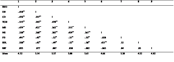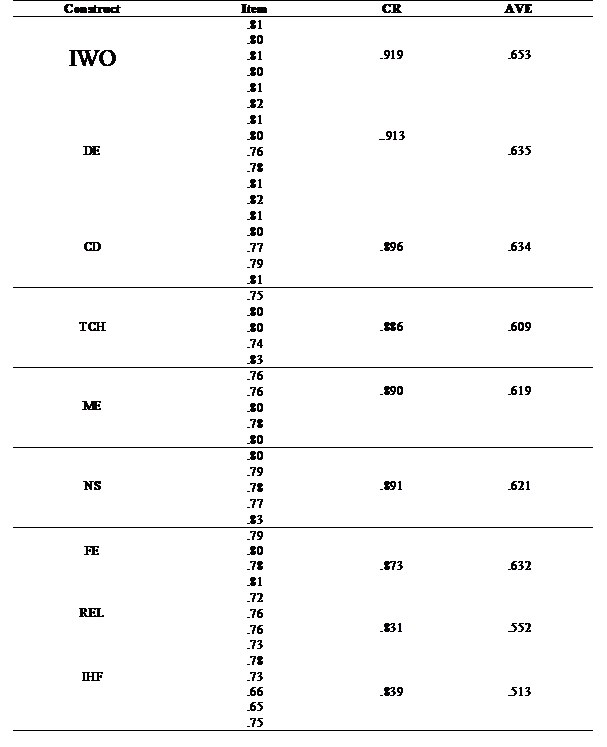 All factors showed particularly good reliability since the CR index takes values from .831 (REL) to .919 (IWO). In terms of discriminant and convergent validity, the AVE index showed satisfactory values for the seven factors, from .609 (TCH) to .653 (IWO). In contrast, the two factors, REL, and IHF, showed marginally acceptable values, .552 and .513 respectively (Table 3).