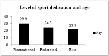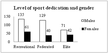 Figures 1 and 2 show the distribution of gender and age in different levels of sport dedication: recreational, federated, and elite athletes. Recreational athletes have experience within local competitions or do not compete. Federated athletes compete in provincial or local sport clubs and schools but not on an international level. Elite athletes were members of national teams or had experience with international competitions.