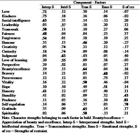 The Character Strengths Rating Form (CSRF; Ruch, Martínez-Martí, Proyer, & Harzer, 2014), which was back-translated to Spanish using the standard procedure. The CSRF is based on Peterson and Seligman’s (2004) classification of 24-character strengths. It consists of 24 items rated on a 9-point Likert-type scale, ranging from 1 = not like me at all to 9 = absolutely like me. Each item is a definition of one-character strength (e.g., “Bravery (valour): Brave and courageous people do not shrink from threat, challenge, difficulty or pain. They speak up for their opinions and convictions even if there is opposition”, or “Perseverance (persistence, industriousness): Persistent and industrious people finish what they start, even despite obstacles. They do not allow themselves to be distracted by inner or outer factors and take pleasure in completing tasks”). The factor structure of the scale was tested. A parallel analysis was performed, and it suggested the extraction of five factors. Afterwards, a Principal Component Analysis (PCA) and a Varimax rotation with Kaiser Normalization were conducted. Five factors were extracted, which could be labelled as interpersonal strengths, intellectual strengths, transcendence strengths, emotional strengths, and strengths of restraint, which was in accordance with previous research (e.g., Ruch et al., 2014). This factor structure (see Table 1) was verified by a Confirmatory Factor Analysis (CFA; RMSEA = .60; CFI = .925).
