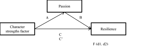Harmonious passion. The results indicated a significant effect of harmonious passion as a mediator on the relationship between all factors of character strengths and resilience (B path). However, the effect of character strengths on resilience controlling for harmonious passion was also significant (C’path). Therefore, harmonious passion partially mediated the relationship between all factors of character strengths and resilience (Table 4).