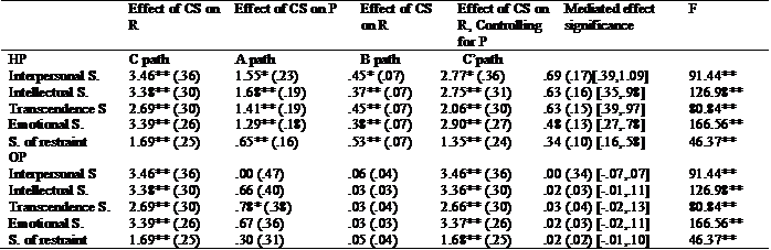 Note. HP = Harmonious passion. OP = Obsessive passion. CS = Character Strengths. R = Resilience. P = Passion. The numbers in parentheses are standard errors. The numbers in brackets are intervals of confidence.