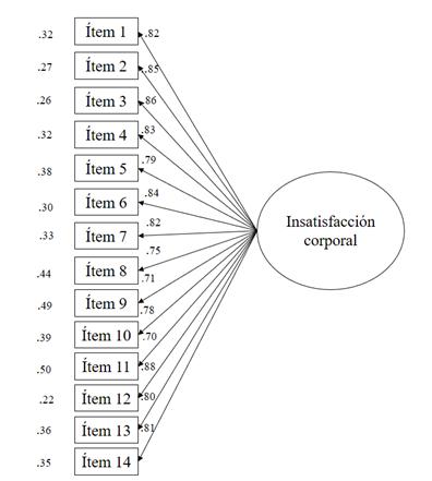 El objetivo principal del estudio fue evaluar la estructura interna del BSQ-14, consistencia interna, validez discriminante e invarianza del modelo considerando la variable de la realización de actividad física. Tal como se asumió en el estudio original del BSQ-1422 y otras validaciones (Czeglédi et al., 2011; Kapstad et al., 2015; Pook et al., 2008; Stefanile et al., 2009; Warren et al., 2008), el AFC del presente estudio identificó una solución de factor único. A pesar que las medidas multidimensionales, como la Multidimensional Body-Self Relations Questionnaire (Cash, 2000), permiten una mejor comprensión de la imagen corporal, las medidas unidimensionales son comunes en los estudios relacionados con la apariencia corporal (por ejemplo, Meneses et al., 2019; Tylka y Wood-Barcalow, 2015). Además, a nivel práctico, tener una escala unidimensional es relevante para los procesos de evaluación, ya que sus ítems reflejarían un constructo específico (en este caso, la insatisfacción) y no otros con los que puede estar relacionado. (como la creencia sobre la apariencia). Si un ítem evalúa no solo la satisfacción corporal sino también la creencia sobre la apariencia, la puntuación total incluiría también información sobre esta última variable. Por lo tanto, la interpretación de la puntuación del BSQ-14, que representa el constructo satisfacción corporal, puede ser errada (Ziegler y Hagemann, 2015). Por otro lado, las medidas unidimensionales permiten a los investigadores evaluar la satisfacción corporal con solo unos pocos ítems. Esto es una ventaja para la ejecución de estudios a gran escala, ya que se reduce el tiempo y el esfuerzo de los participantes.