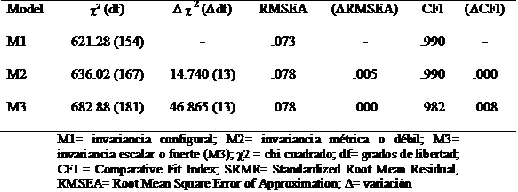 Se utilizó un AFC multigrupo para evaluar la invariancia de la medición del BSQ-14 según la actividad física (mujeres que realizan actividad física versus mujeres que no realizan actividad física). Se probó la invariancia de la medición en etapas progresivamente restrictivas (Vandenberg y Lance, 2000): Primero, la prueba de invariancia configural (M1) permite estimar libremente las cargas factoriales, interseptos y residuos. M1 implica que el marco conceptual es el mismo en todos los grupos, por lo que permite establecer un modelo de referencia para los análisis posteriores. Segundo, se evaluó la invariancia métrica o débil (M2), donde todas las cargas factoriales estaban restringidas de la misma manera. Tercero, se llevó a cabo la invariancia escalar o fuerte (M3), donde las cargas factoriales e interceptos de los ítems eran iguales en los grupos comparados. Las pruebas de M2 y M3 se examinaron a partir del cambio en los valores de CFI (ΔCFI) y RMSEA: ΔCFI> -.01, ΔRMSEA <.015 (Cheung y Rensvold, 2002).