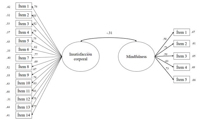 Con respecto a la evidencia de validez basada en las relaciones que las puntuaciones del test presentan con variables externas de tipo concurrente, El modelo que relacionó la insatisfacción corporal y el mindfulness tuvo un buen ajuste (χ2 = 316.347, p= .00, RMSEA= .05 [IC90%: .04 -.06], CFI= .94, SRMR= .05) y la correlación fue negativa y moderada (r = -.31, p <.001) como se esperaba. El modelo puede verse en la figura 2.