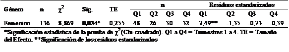 La distribución por trimestre de nacimiento de las jugadoras de balonmano se presenta en la tabla 1.