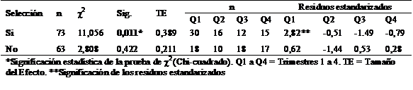 Si se clasifica a las jugadoras en función de que hayan participado o no en las selecciones nacionales (Tabla 2), se han encontrado diferencias entre las distribuciones observadas y las esperadas en las jugadoras seleccionadas (χ2= 11,056; g.l.= 3; p<0,012), mostrándose una sobre representación de jugadoras nacidas en el primer trimestre del año, en tanto que en las jugadoras no seleccionadas no se ha encontrado un efecto de la edad relativa.