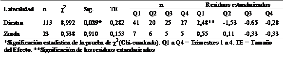 Si se clasifica a las jugadoras en función de su lateralidad (Tabla 3), se encuentran diferencias entre las distribuciones observadas y las esperadas en las jugadoras diestras (χ2= 8,825; g.l.= 3; p<0,033), mostrándose una sobre representación de jugadoras nacidas en el primer trimestre del año, en tanto que en las jugadoras zurdas no se han encontrado diferencias significativas.