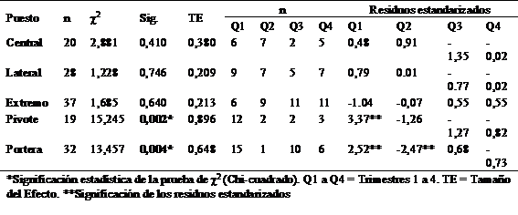Si se clasifica a las jugadoras en función de su posición (Tabla 4), se encuentran diferencias entre las distribuciones observadas y las esperadas en las posiciones de pivote (χ2= 15,245; g.l.= 3; p<0,003) y portera (χ2= 13,457; g.l.= 3; p<0,005), mostrándose tanto en el caso de las pivotes como de las porteras una sobre representación de jugadoras nacidas en el primer trimestre del año y una baja representación en el segundo trimestre del año en el caso de las porteras. Por el contrario, en los puestos específicos de central, lateral y extremo, no se han encontrado diferencias significativas.