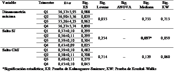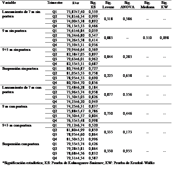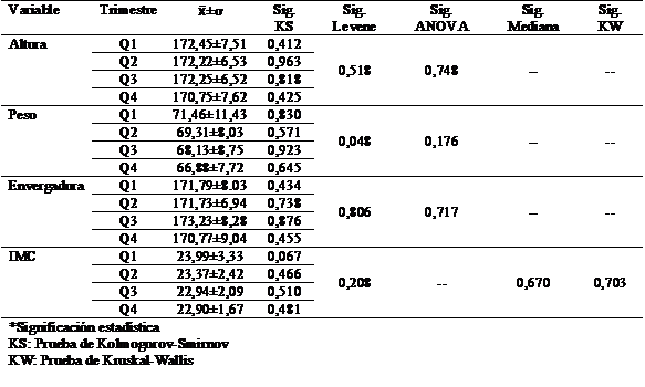 Para comparar las variables antropométricas, de condición física y los aspectos técnico-tácticos entre los trimestres del año se ha realizado un ANOVA, garantizando previamente la normalidad (prueba KS) y la igualdad de varianzas (Levene). En caso de no cumplirse alguno de los prerrequisitos, se aplicarán las pruebas no paramétricas de la Mediana y la prueba de Kruskal-Wallis.