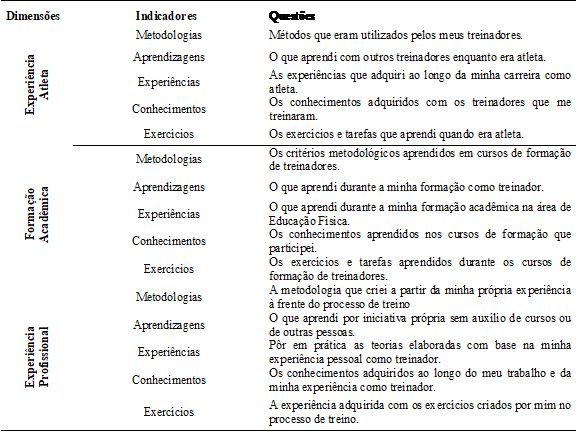 Cada dimensão possui cinco indicadores que contemplam os momentos de aprendizagens, experiências, conhecimentos, metodologias e exercícios vivenciados pelos treinadores. O instrumento (Tabela 01) é composto de 15 questões com respostas em escala tipo Likert de 1 a 10 (1= Discordo Plenamente e 10= Concordo Plenamente).