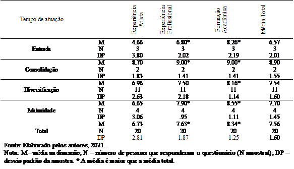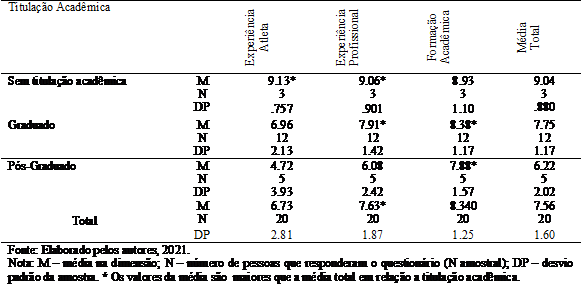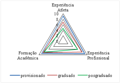 Associada a esta elevada valorização da aprendizagem formal pelos treinadores investigados, identificou-se menor importância dada as FCs procedentes das “experiências de atleta” e “experiência profissional” (aprendizagem informal), sendo desvalorizadas à medida que se aumenta o nível da titulação acadêmica.