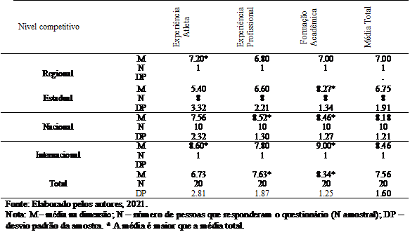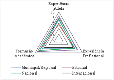 As FCs procedentes da formação acadêmica (8.340±1.251) e da experiência profissional (7.630±1.875) também eram as mais utilizadas pelos treinadores para a construção do processo de treino em relação ao nível competitivo (tabela 3 e figura 2).