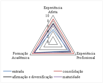 Em relação aos ciclos de desenvolvimento profissional, as fontes de conhecimento procedentes da formação acadêmica eram as mais utilizadas na estruturação do processos de treino pelos treinadores, independentemente do tempo de atuação profissional (Tabela 4 e figura 3).