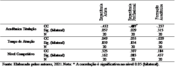 Além disso, os resultados indicaram pouca relação entre a utilização das FCs e em função dos aspectos relacionados a titulação acadêmica, tempo de atuação e o nível competitivo, exceto a relação negativa entre as FCs procedentes da experiência profissional e a titulação acadêmica do treinador (-.487 para p=.029), conforme os resultados da correlação de Spearman apresentados na Tabela 5.