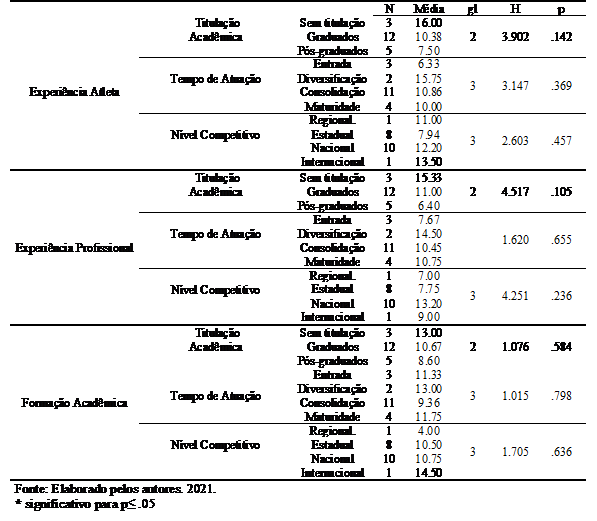 Todavia, recorreu-se ao teste de Kruskal-Wallis para verificar a existência de diferenças estatisticamente significativas entre as procedências das FCs e os aspectos relacionados a titulação acadêmica, tempo de atuação e o nível competitivo dos treinadores de basquetebol do estado do Paraná, sendo que os resultados indicaram que não existiam diferenças significativas em relação aos aspectos mencionados, conforme resultados apresentados na tabela 6.