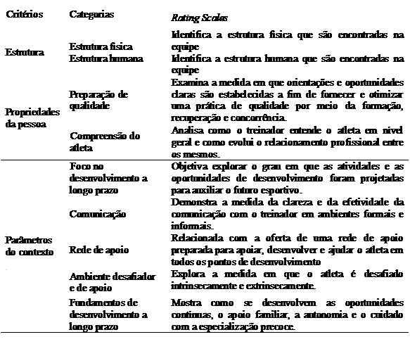 O roteiro de observação foi fundamental para diferenciar os fatores apresentados em cada equipe. Focando na interpretação das ações, ambientes e relação com os formadores, o roteiro de observação se atentou em descrever desde a estrutura física e humana encontradas nas equipes, até os sete fatores do Talent Development Environment Questionnaire (Martindale et al., 2010), confrontando ou reforçando as principais características relatadas pelos atletas (Tabela 2).