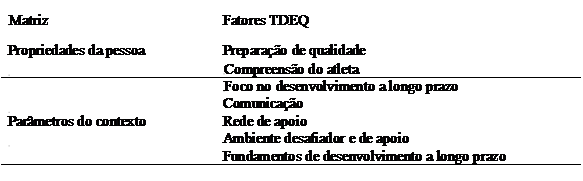Em relação as propriedades da pessoa, podemos constatar que os fatores “preparação de qualidade” e “compreensão do atleta” se enquadram na categoria de análise por contemplarem os recursos e demandas que cada microssistema oferece, além de analisarem o atleta holisticamente, de maneira completa, tirando proveito de forma otimizada das suas características para o seu desenvolvimento (Martindale et al., 2010).