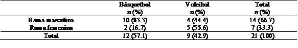 Participaron 21 entrenadores de básquetbol y voleibol que dirigen equipos de categorías formativas (u15, u17 y u19) en las respectivas federaciones deportivas del Área Metropolitana de Buenos Aires (Argentina). La distribución de los participantes en función del deporte y la rama se presenta en la Tabla 1. Respecto del género, casi la totalidad de los participantes fueron entrenadores de género masculino (n = 20) a excepción de una entrenadora (n =1). La edad media de los participantes fue de 35.5 años (DT = 8.9), y todos ellos realizaron al menos dos niveles de los cursos nacionales de entrenador (siendo cuatro en total en el voleibol y tres en el básquetbol). Entre los participantes, 20 entrenadores (95.2%) tenían un trabajo adicional al momento de la recolección, la mitad de los cuales se desarrollaban en rubros no relacionados a la actividad física. La mayoría de los entrenadores (71.4%) refirieron dedicarse a tiempo parcial a su labor de entrenador. Todos los entrenadores entrevistados fueron jugadores de sus respectivos deportes, y 13 de ellos (61.9%) continúan su práctica en la actualidad.