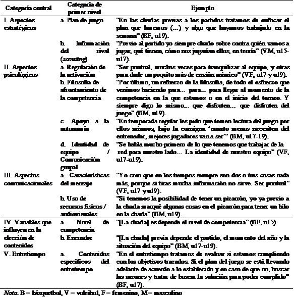 En la Tabla 2 se presenta un resumen de las categorías de primer nivel (códigos) y las categorías centrales (familias de códigos) de las charlas previas y de entretiempo, con ejemplos de fragmentos de las entrevistas de los entrenadores. A continuación, se describen las categorías propuestas y los criterios definidos para la inclusión de elementos en cada una de ellas.