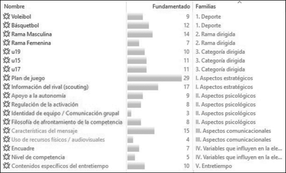 El código “Plan de juego” obtuvo la mayor cantidad de fundamentaciones (n = 29), seguido por “Información del rival (scouting)” (n = 17), mientras que “Identidad de equipo / Comunicación grupal” fue el menos codificado (n = 3). Los códigos vinculados al deporte (“Básquetbol” y “Voleibol”), la rama (“Rama Masculina” y “Rama Femenina”) y la categoría (“u15”, “u17” y “u19”) fueron códigos “descriptores” que se utilizaron para caracterizar a los participantes. En la Tabla 3 se presenta la frecuencia de entrenadores que mencionaron alguna de las categorías en función de los códigos descriptores (deporte, rama y categoría dirigida).