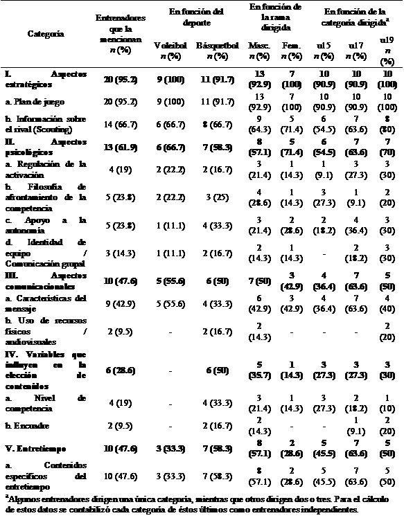 La primera de estas categorías (i.e. los aspectos estratégicos) refiere a la información del plan de juego tanto del propio equipo como del rival (scouting) mientras que los aspectos psicológicos reflejan las acciones realizadas por el entrenador que buscan producir un efecto en los aspectos personales de los deportistas, como la regulación de la activación, la manera de afrontar la competencia (el partido en sí), así como también en los aspectos sociales, como la identidad de equipo y la comunicación grupal.