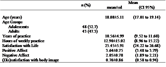 A sample of 91 Portuguese dancers (18.08 ± 5.11 years) was recruited and divided into two groups (adolescents 11-17 years; adults 18-34 years).