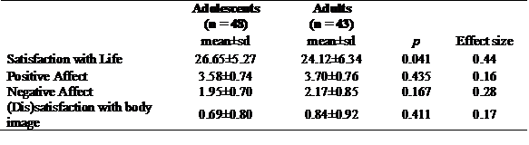 The results indicate that the group of adolescents presented a higher perception of satisfaction with life compared to adults (see table 2). In the other variables, there were no statistically significant differences between the two groups.