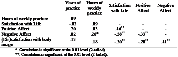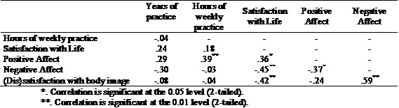 Table 1 presents a summary of the descriptive statistics of sociodemographic and study variables. Our sample has an average of 10.56 years of practice and an average of 12.90 hours of practice per week. Regarding satisfaction with life, the average of the sample is 25.45 (on a scale that would range from 5 to 35), while regarding the emotional dimension of subjective well-being, the values of positive affect are higher than those of negative affect. Finally, the (Dis)satisfaction with body image has an average value of 0.76.
