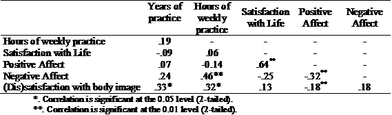With regards to (dis)satisfaction with body image, we found that in the group of adolescents (see table 4), it is related to the years of practice and the weekly hours of practice, while in the adults’ group (see table 5), it is negatively related to satisfaction with life and negative affect are related.