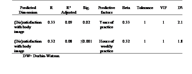 Regarding the analysis of linear regression (see table 5), based on the correlations found in the group of adolescents, we found that the regressions are significant. Years of practice explained 9% of the variation in (dis)satisfaction with body image [0.009 -0.121] while the number of hours of weekly practice explained 8% [0.002-0.026]. There was also a lack of outliers.