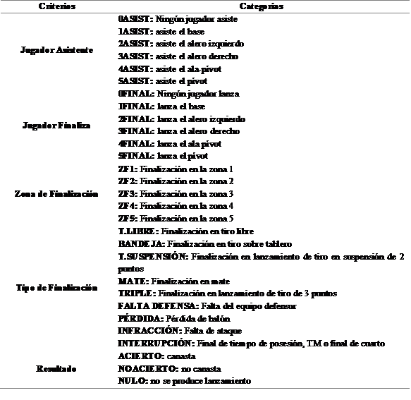 Para realizar el registro y codificación de los datos, el análisis secuencial, el análisis de coordenadas polares y su representación vectorial se utilizó el software informático HOISAN (Hernández-Mendo, López-López, Castellano, Morales-Sánchez y Pastrana, 2012). La herramienta de observación usada en esta investigación ha sido creada y diseñada ad hoc y ha superado las pruebas de calidad del dato exigibles en MO (Morillo-Baro y Hernández-Mendo, 2015). Está construida mediante un sistema mixto de formato de campo y sistemas de categorías, exhaustivas y mutuamente excluyentes (E/ME). Está compuesta por 5 criterios y 29 categorías que se corresponden con el desarrollo técnico-táctico de una acción ofensiva en baloncesto. La tabla 2 muestra la composición de la herramienta de observación.