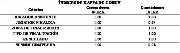 Como se puede observar, el índice de Kappa de Cohen para esta investigación supera el 0.90 tanto para la fiabilidad intraobservador (1.00) como para la interobservador (0.98). Estos resultados muestran una alta fiabilidad atendiendo a los valores propuestos por Gelfand y Hartmamm (1975) y Landis y Koch (1977).