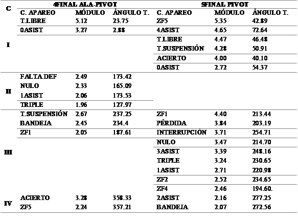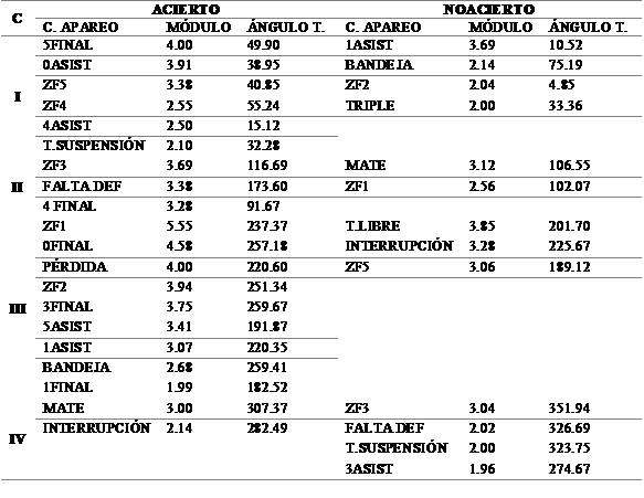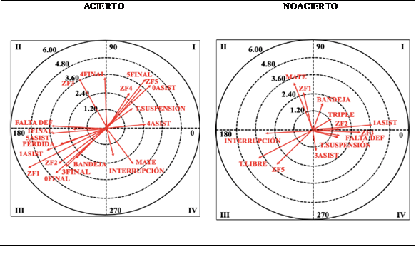 En la tabla 6 se muestran los resultados del análisis de coordenadas polares realizados con las conductas focales acierto y no acierto en la finalización de las acciones de los jugadores.