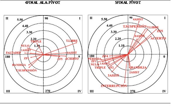 Los resultados de los análisis de coordenadas polares se muestran por las parejas de conductas focales seleccionadas; el jugador que finaliza: 4FINAL (ala-pívot) y 5FINAL (pívot) y el resultado de las acciones: ACIERTO y NOACIERTO.