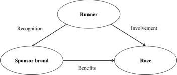 Activity involvement is an expression of an individual's interest in a specific sports activity and has been defined as "an unobservable state of motivation, arousal or interest towards a recreational activity or associated product” (Havitz & Dimanche, 1997, p. 246). Involvement is an important factor because of its potential influence on people’s attitudes and behaviour in relation to a given product or activity (Ridinger et al., 2012), including the processing of sponsorship information in consumers’ minds (Dos Santos et al., 2016). The logic of this relationship seems to lie in a sponsor/sponsored-activity relationship. There is a positive emotional orientation towards the sponsor who bestows benefit on the consumer’s favoured activity, in our case, the practice of running (Meenaghan, 2001). This triangular relationship between runner, race (activity) and sponsor brand is shown in Figure 2.