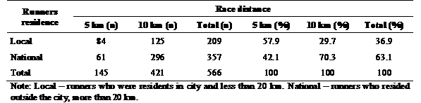In the current survey, 52.9% of the respondents were men and 47.1% were women. The runners' ages ranged between 18 and 68 years old (M = 41.22, SD = 9.29), with respondents being in the categories of 45-54 years old (27.2%), 35-44 years old (42.0%), 25- 34 years (19.0%), 55-64 years (7.8%), 18-24 years (3.4%) and over 65 years (0.7%). Most respondents were married (46.4%), followed by singles (28.2%), in de facto union (16.2%), divorced (8.3%) and widowed (0.9%). More than half of the runners (63.3%) lived outside the city where the race took place (more than 20 km), designated “national”, while 36.7% came from the city of Santarém and less than 20 km, and were designated “local”. In the 5 km race, 57.9% of runners were local, while in the 10 km race, 70.3% were national, see Table 1.
